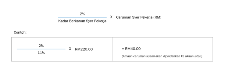 i. Upah suami: RM2000.00 ii. Kadar berkanun syer pekerja: 11% iii. Amaun caruman syer pekerja: RM220.00 (RM2,000 x 11%) iv. Amaun pindahan ialah: RM 40.00 |